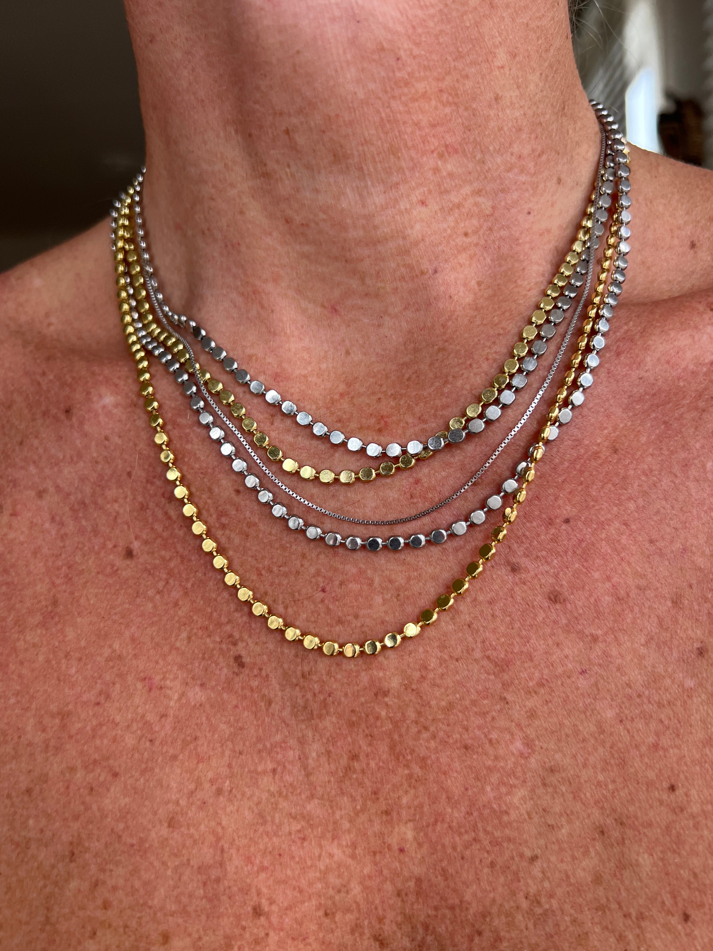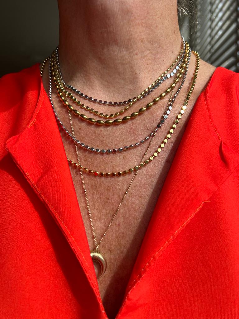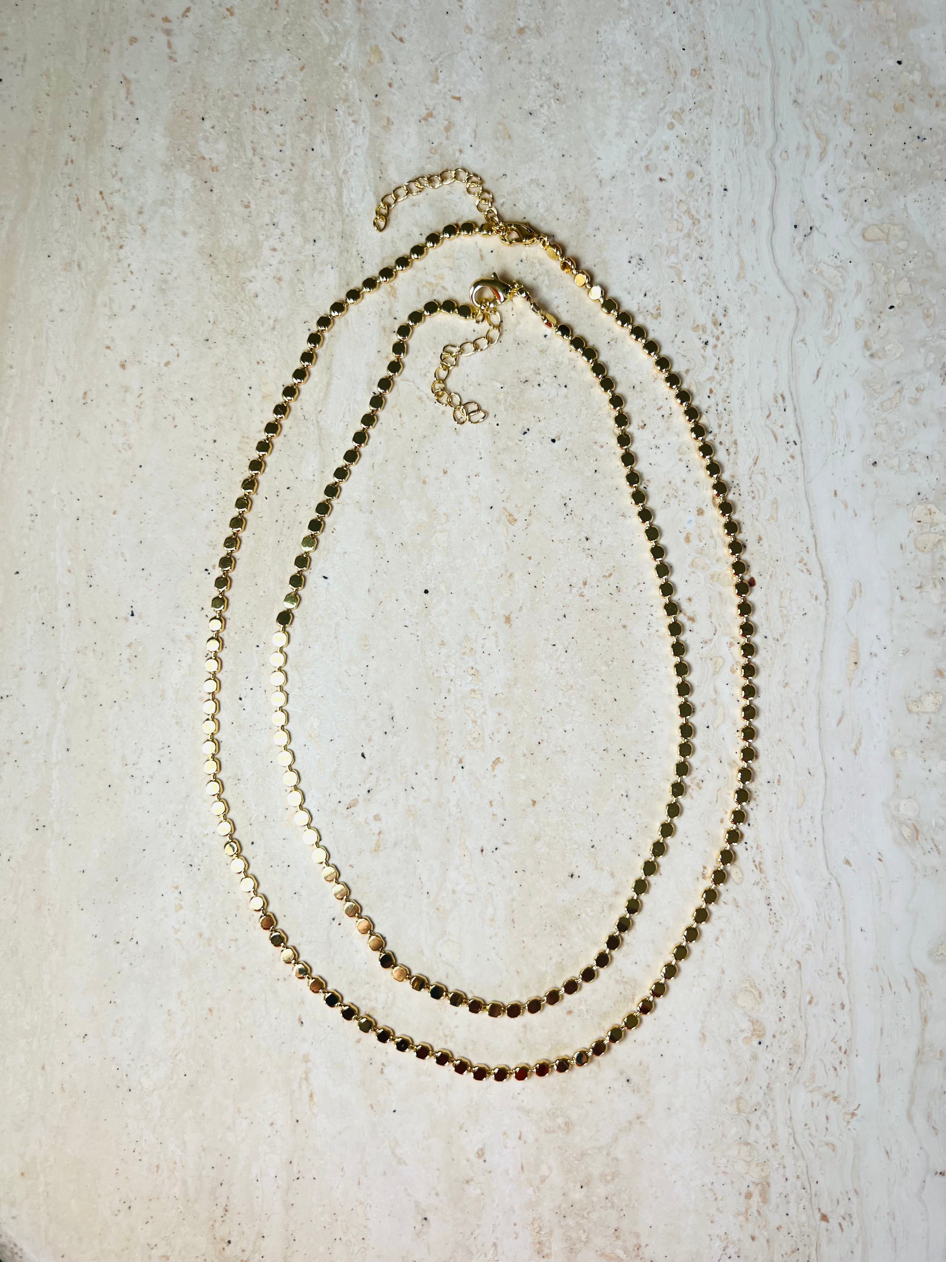 This 14 kt goldplated shine Disco Necklace is the perfect layering accessory for any night out! It sparkles and shines, giving your outfit the extra glam you need on the dance floor! Get ready to boogie down in style!