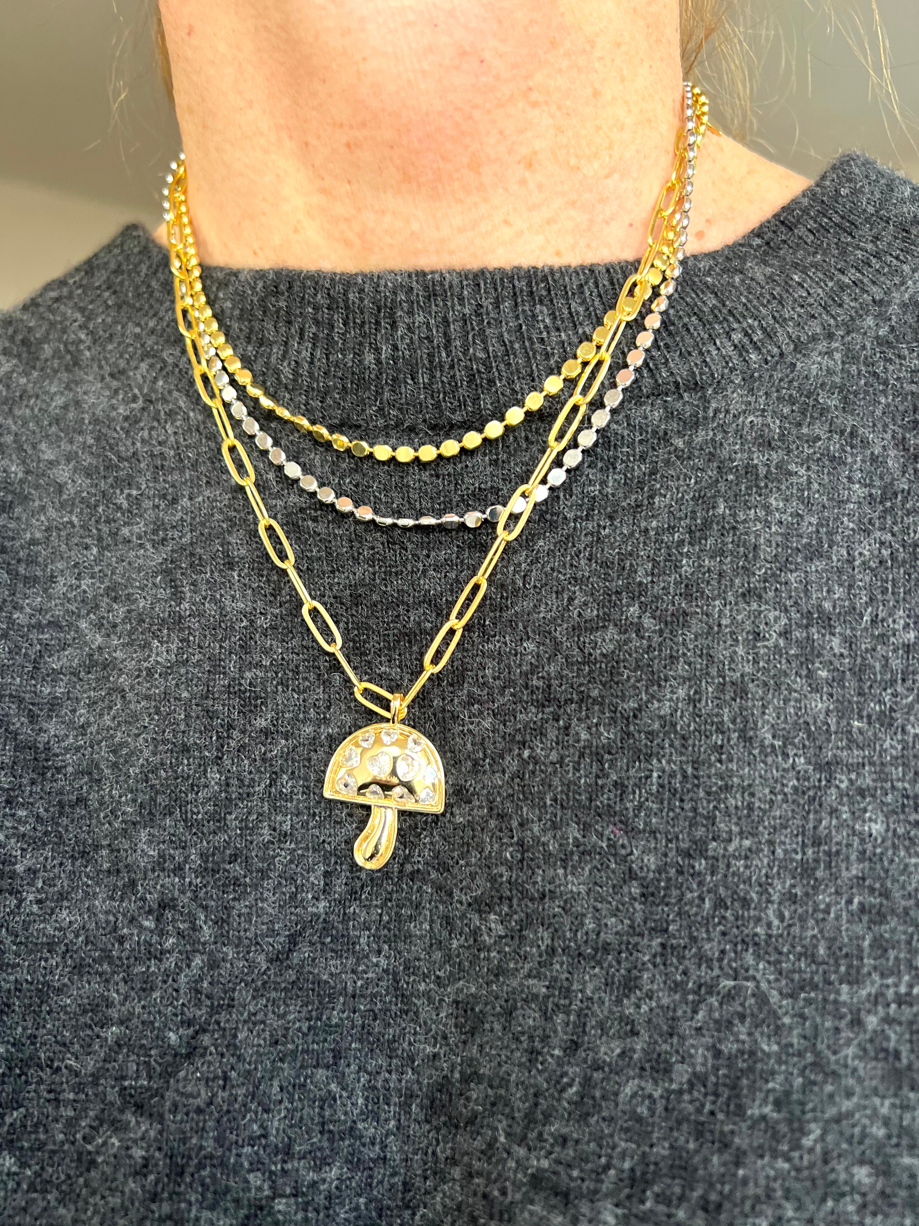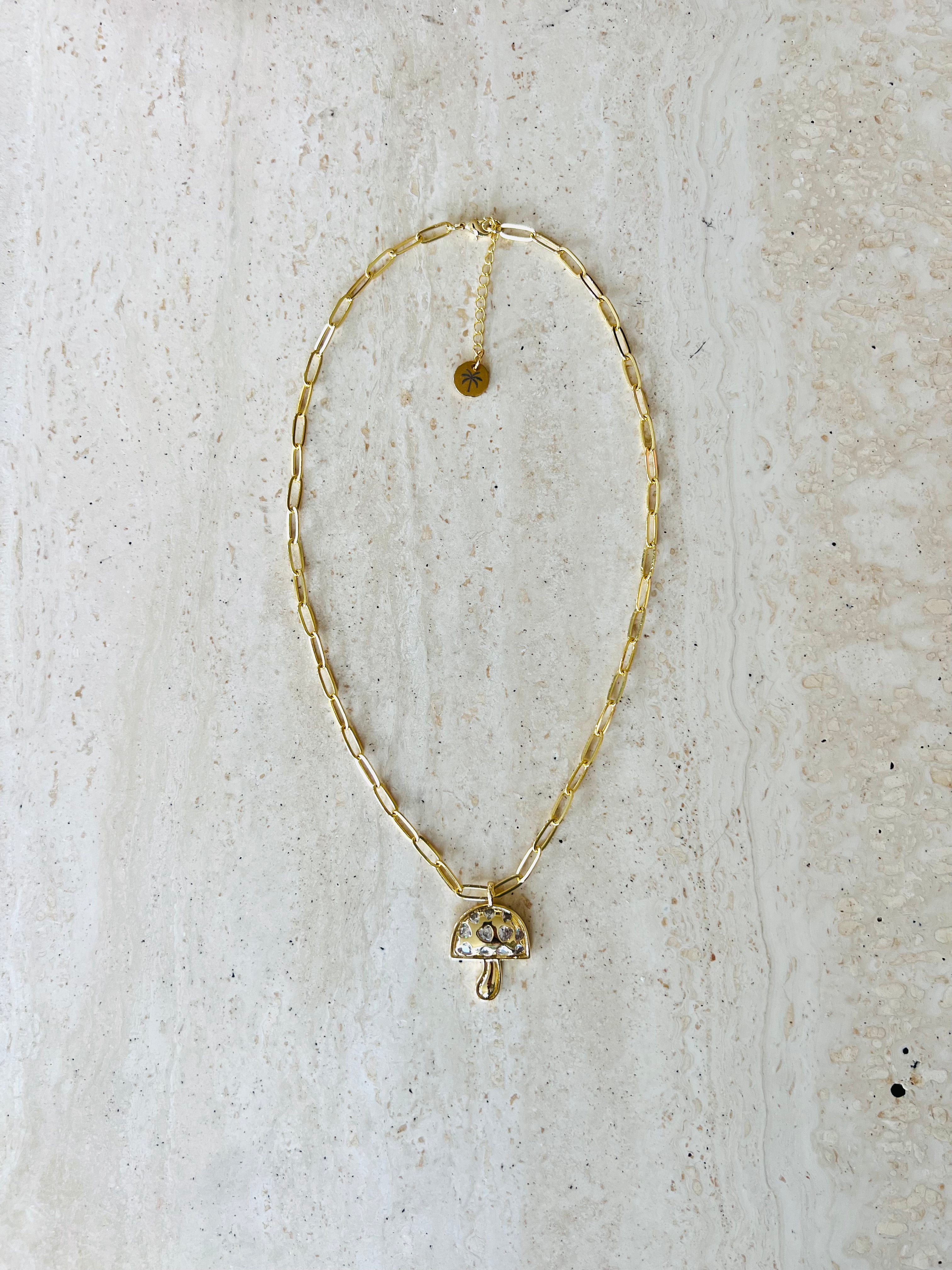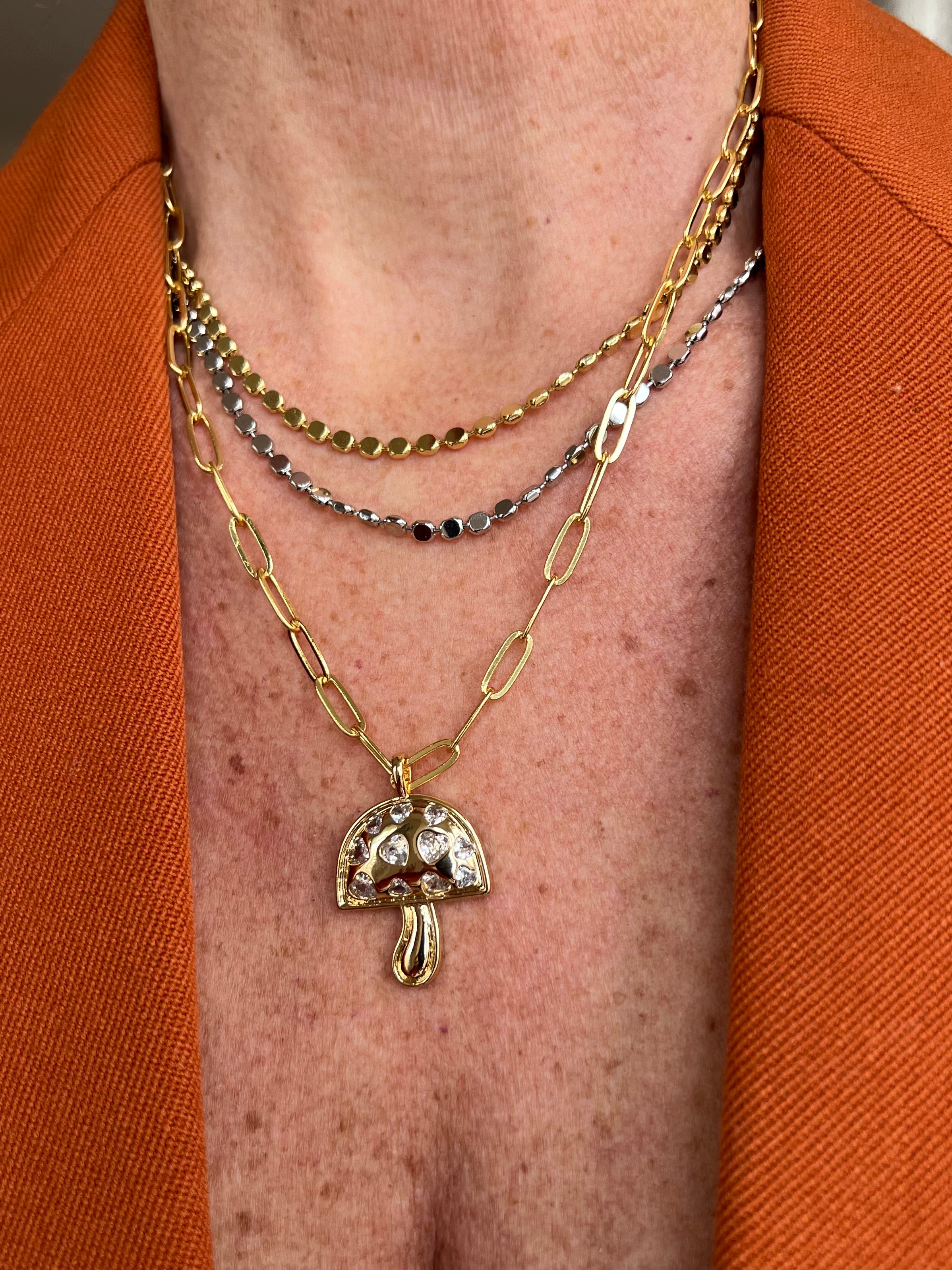 Add a touch of fun to your look with this eye-catching Magic Mushroom necklace! Crafted with a 18 kt goldplated chain and mushroom charm, this piece sparkles with clear zirkonia hearts. It's the perfect way to bring some quirkiness to your ensemble!