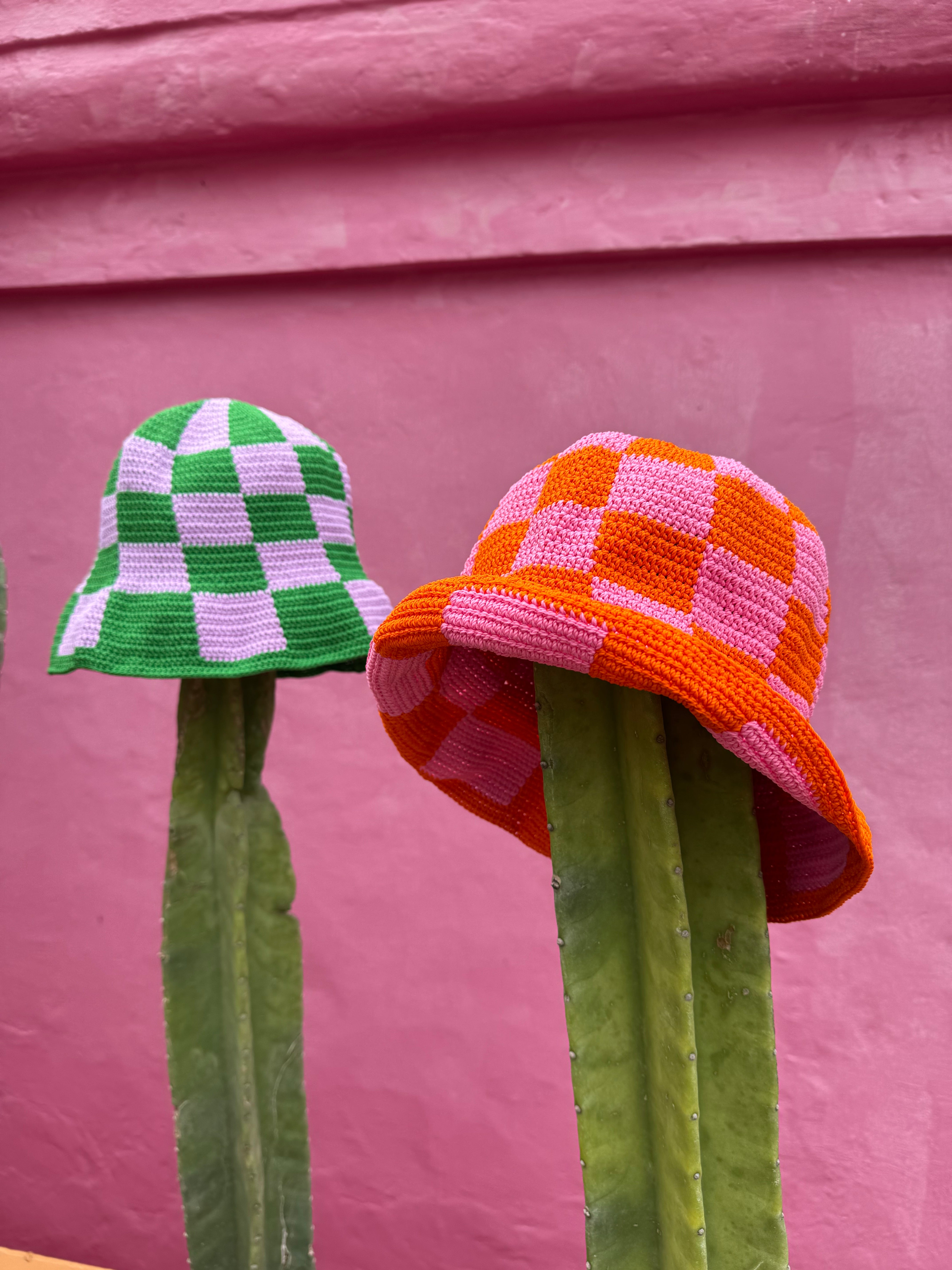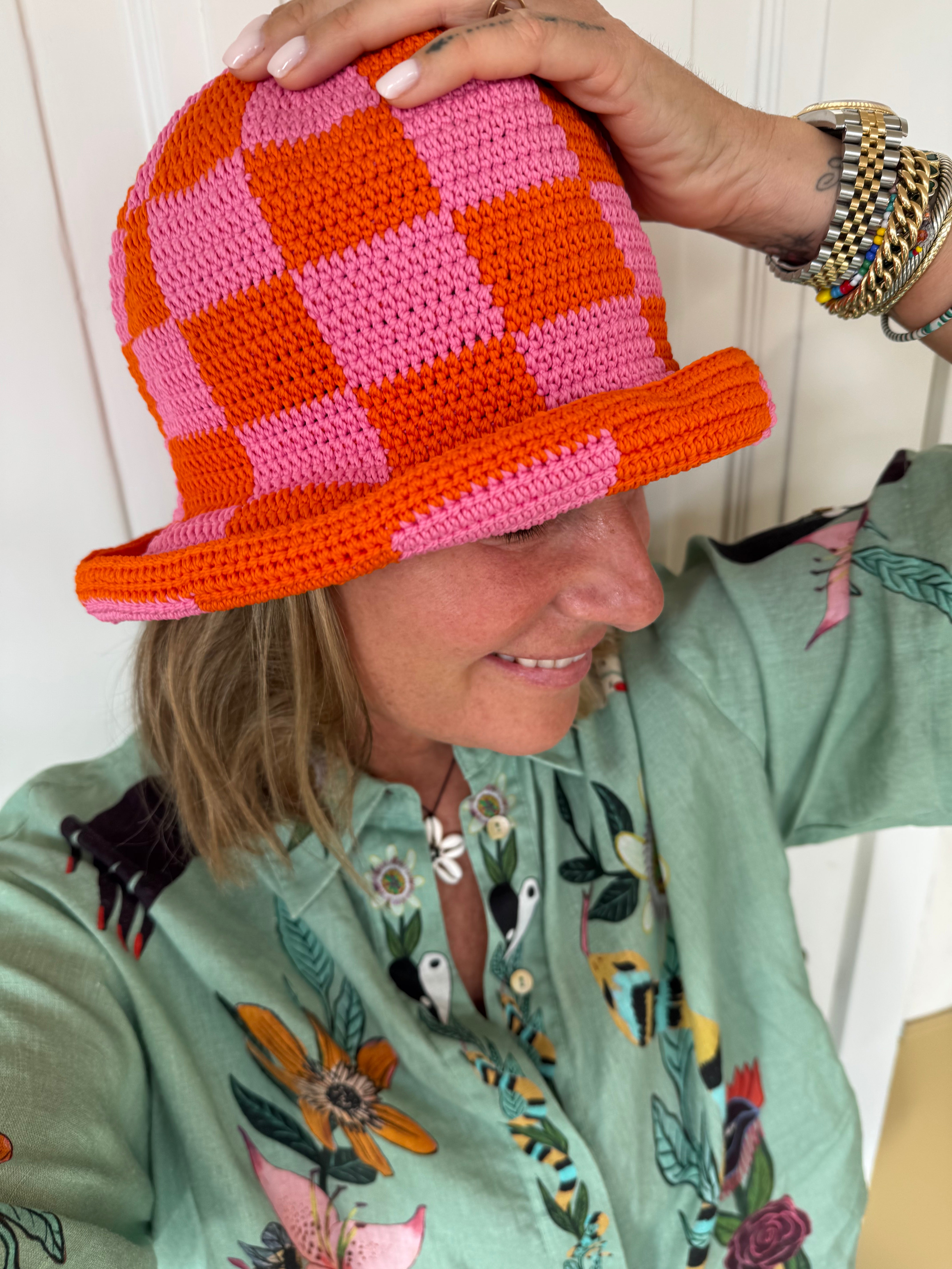 Get ready to turn heads with the Mary hat! Named after the Balinese woman who makes them. This unique, handcrafted crochet hat is a must-have for any summer outfit. Each hat takes 2 days to create and features a vibrant two-tone check pattern. Stand out from the crowd with this fun and playful accessory!