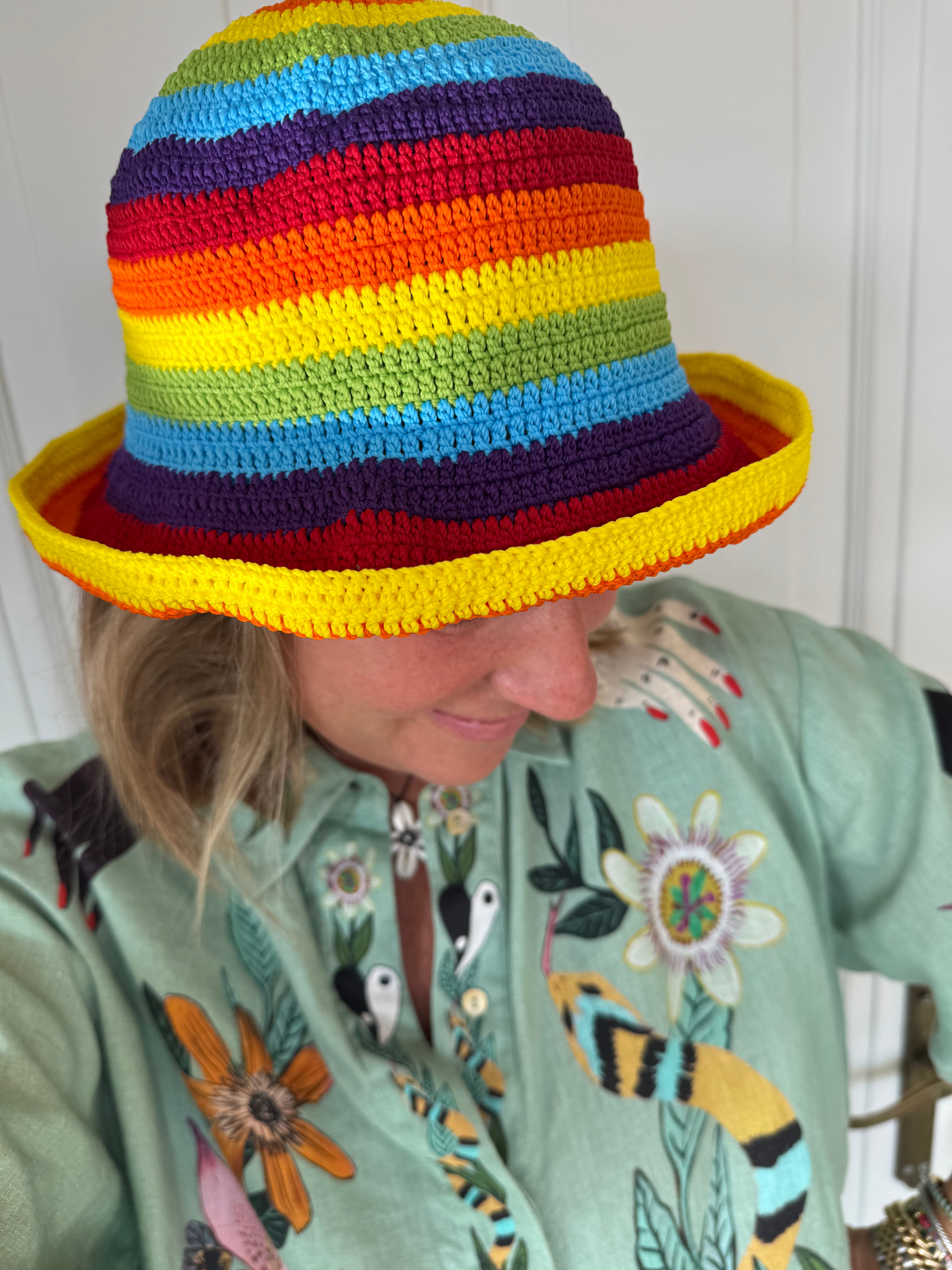 et ready to turn heads with the Mary hat! Named after the Balinese woman who makes them. This unique, handcrafted crochet hat is a must-have for any summer outfit. Each hat takes 2 days to create and features a vibrant two-tone check pattern. Stand out from the crowd with this fun and playful accessory!