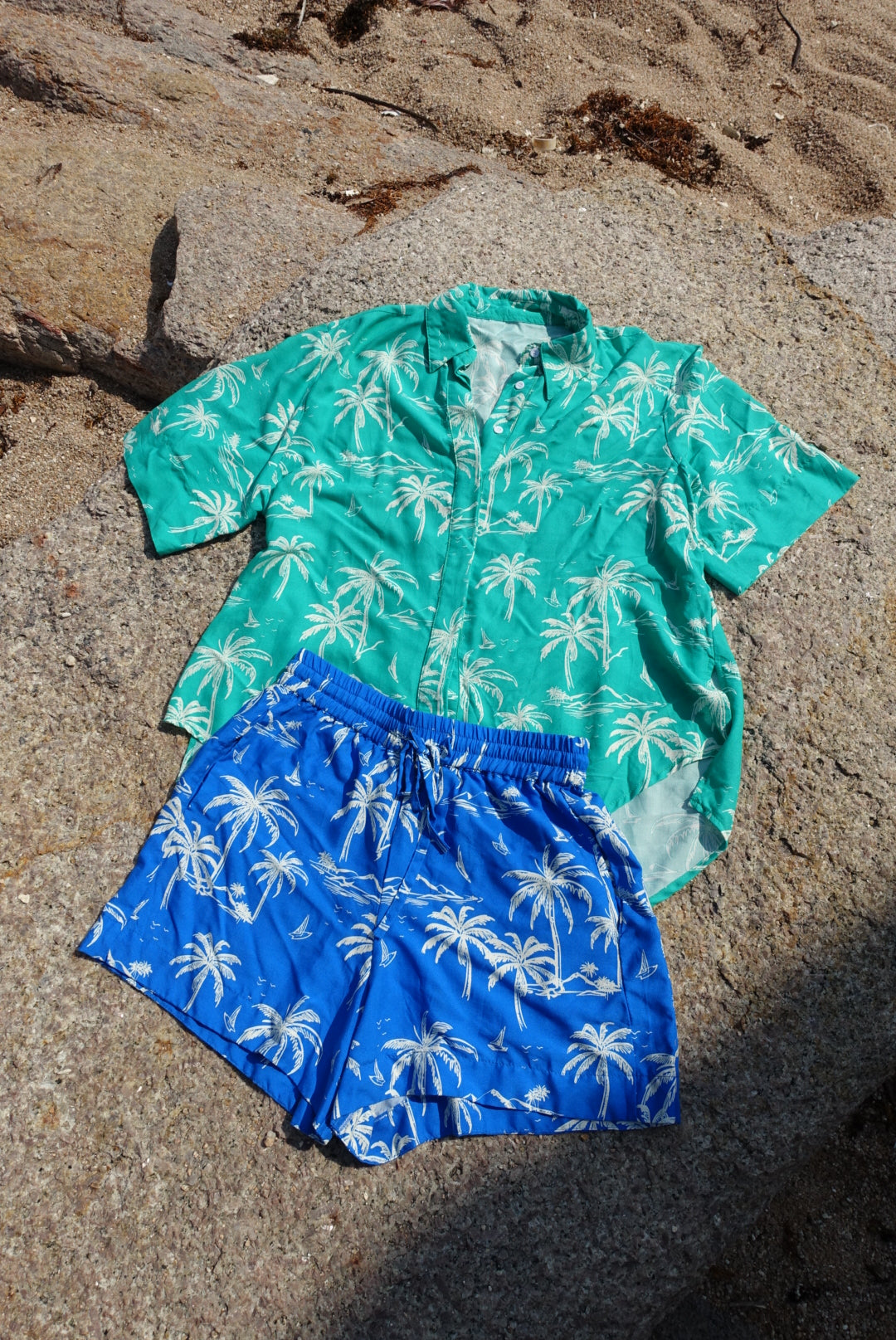 Explore paradise in style with our two-tone co-ord set! Made from lightweight rayon fabric, the green top and blue shorts feature a playful palmtree print. Perfect for a fun and stylish summer look. (Note: No actual paradise included.)