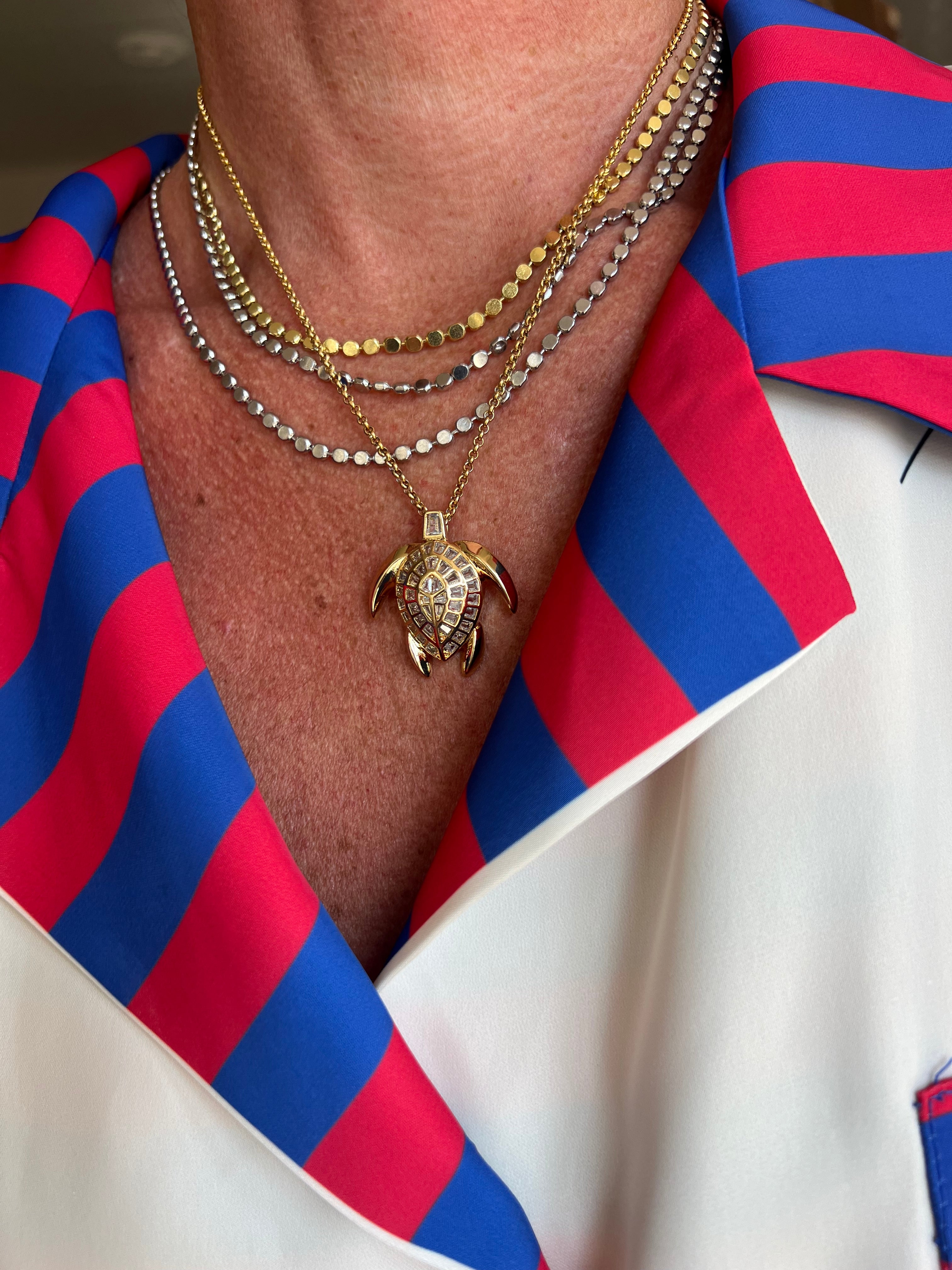 You can combine the turtle necklace with our disco necklace for that layered look.