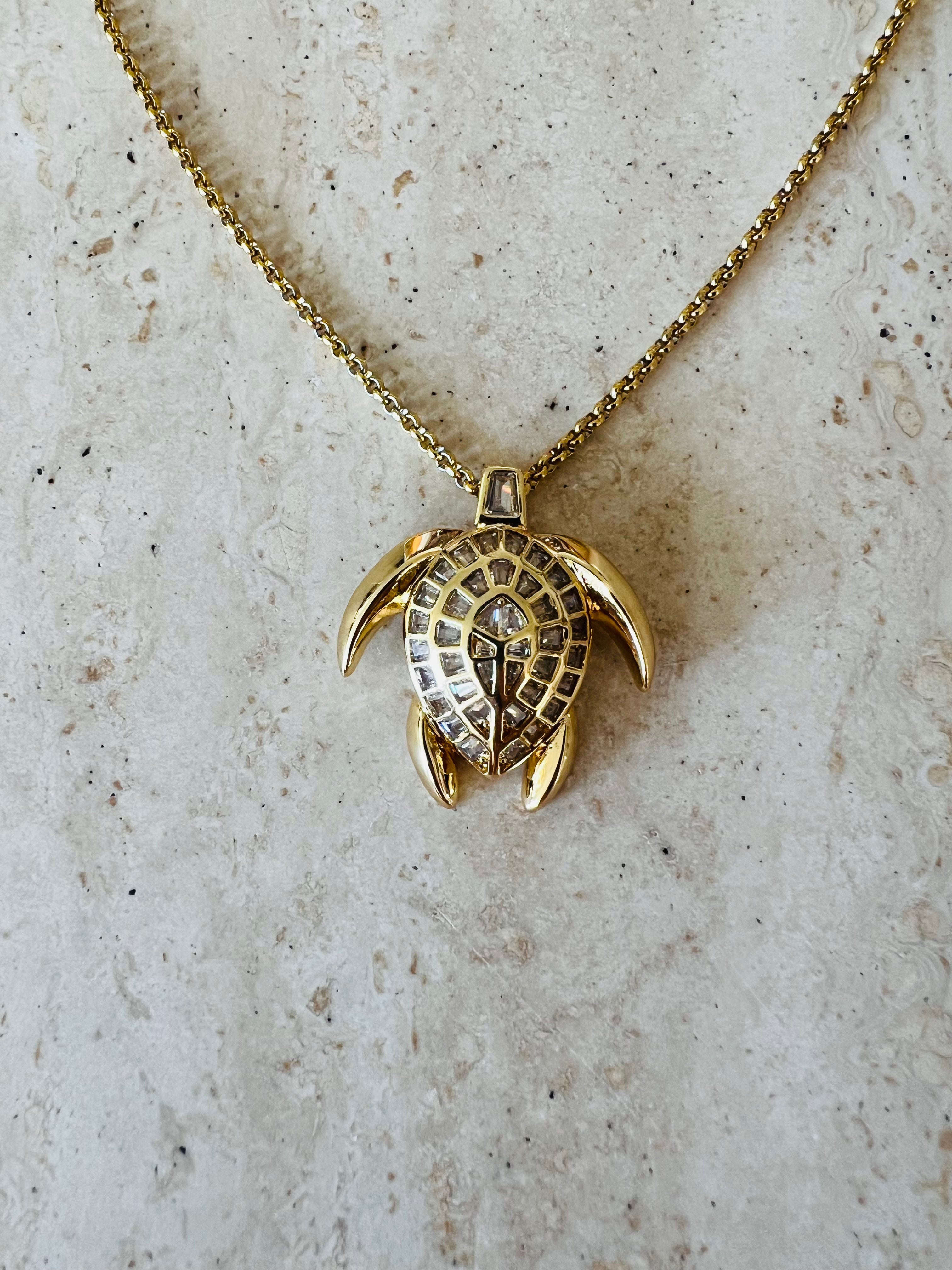 Make a splash with this beautiful turtle necklace! The eye-catching gold plated turtle pendant, with its sparkling cubic zirconia, is sure to become your go-to accessory. All that bling hangs perfectly from the gold-plated chain - why not show off your style and jump in with both feet?