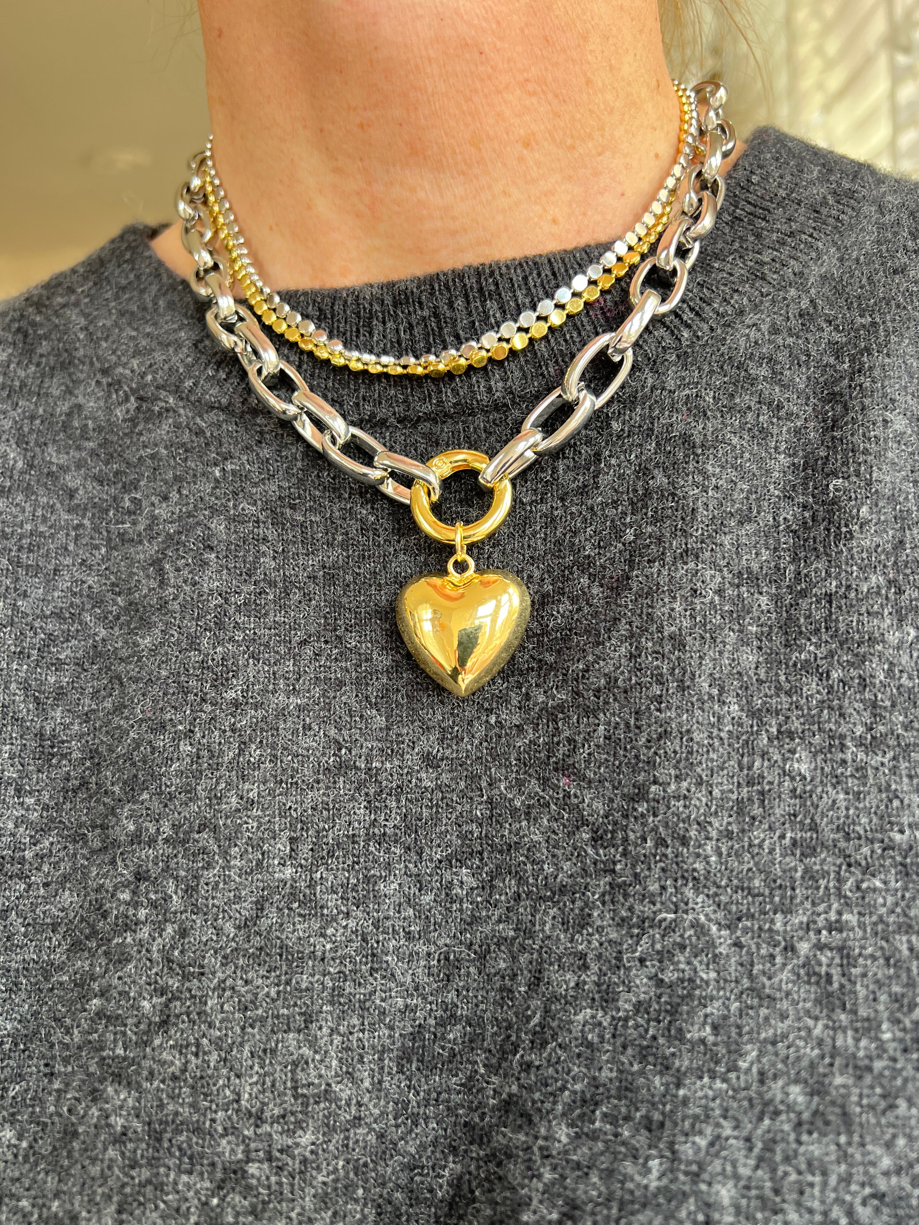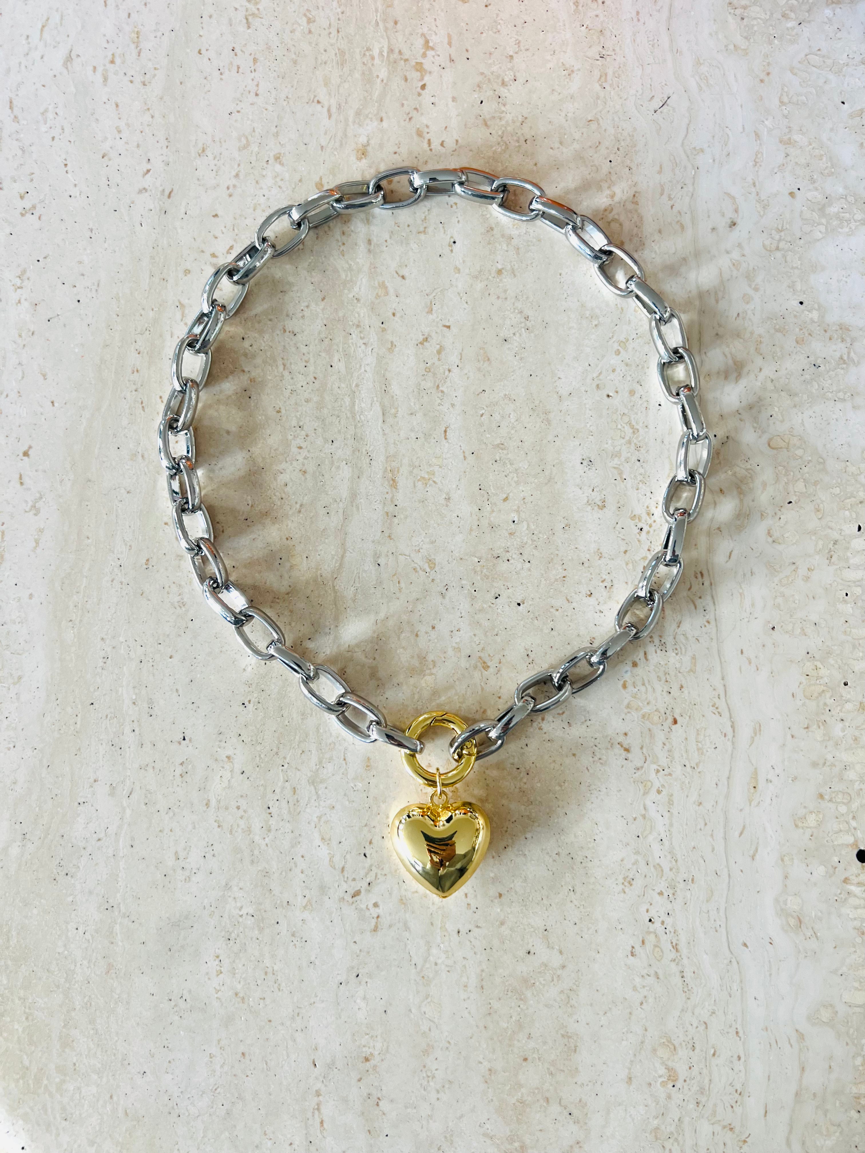 Bring a little love and attitude to your look with this unchain my heart necklace! The chunky silver plated chain is decorated with a gold-plated lock and heart pendant, making it the perfect accessory for showing off your style. Let your heart shine with this sassy statement piece!