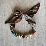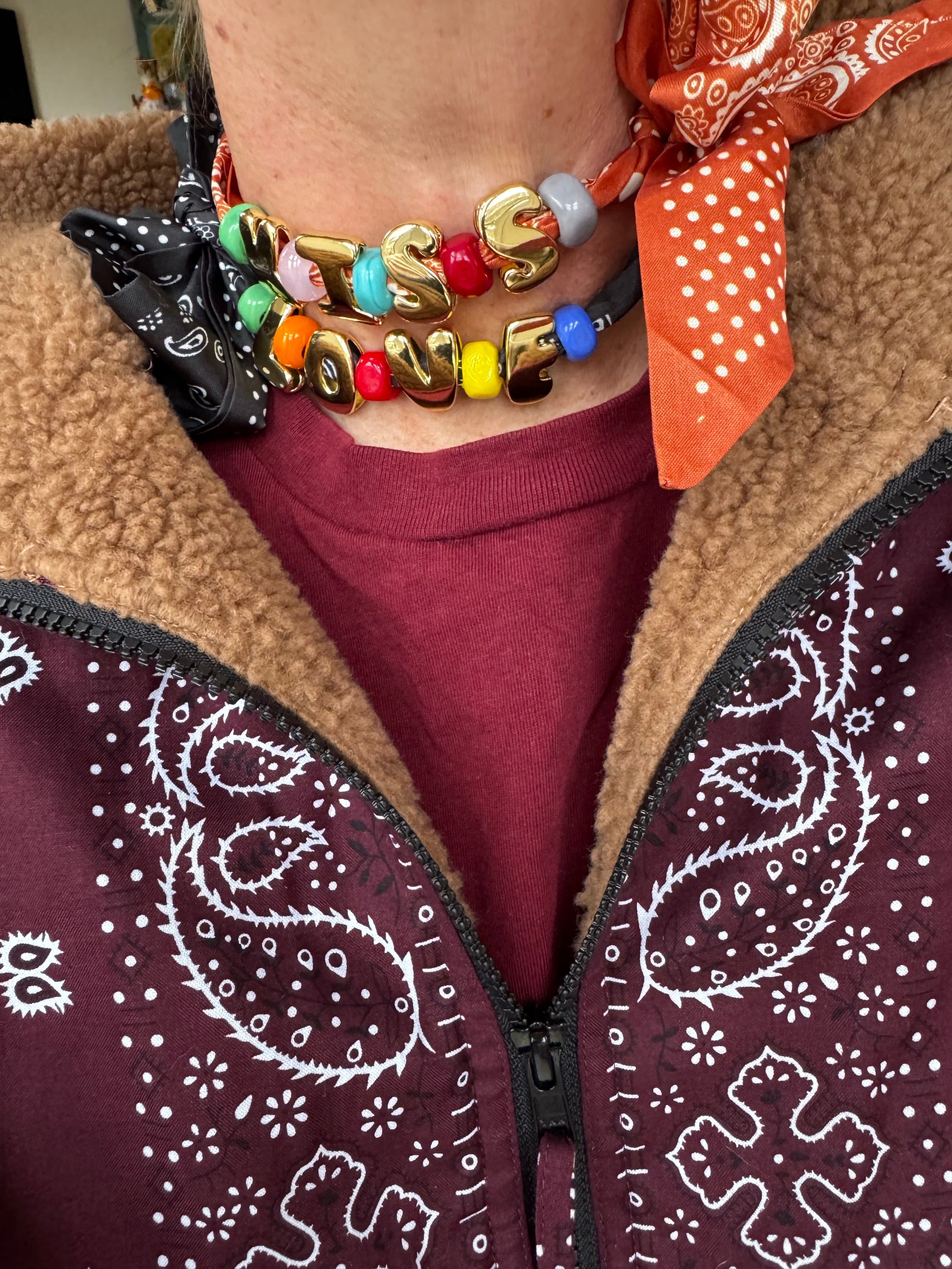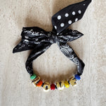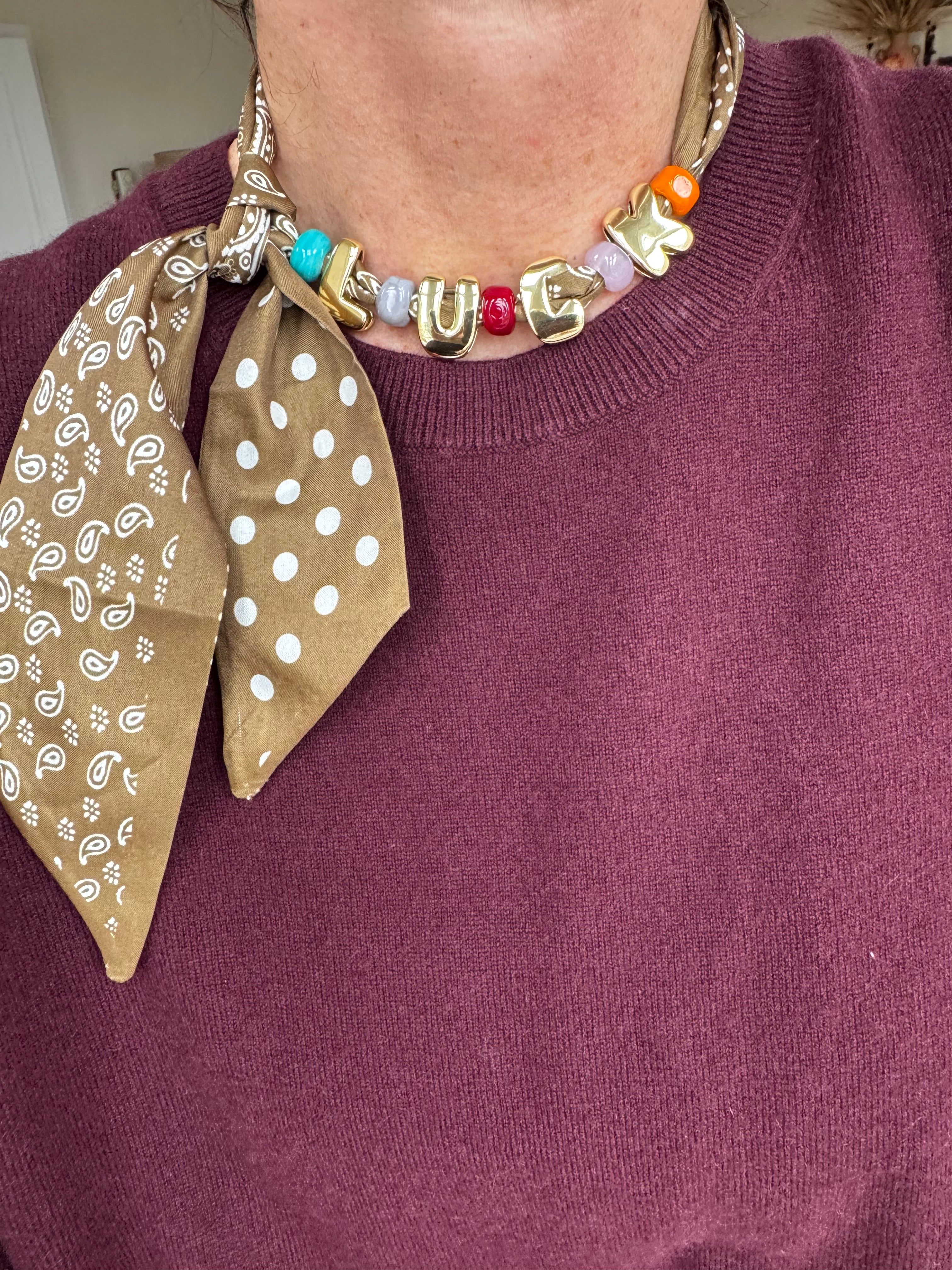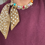 The Bandana Necklace combines bold gold-plated letters with hand-blown colorful beads, strung onto a silky satin-feel scarf featuring a mixed bandana and polka-dot print.