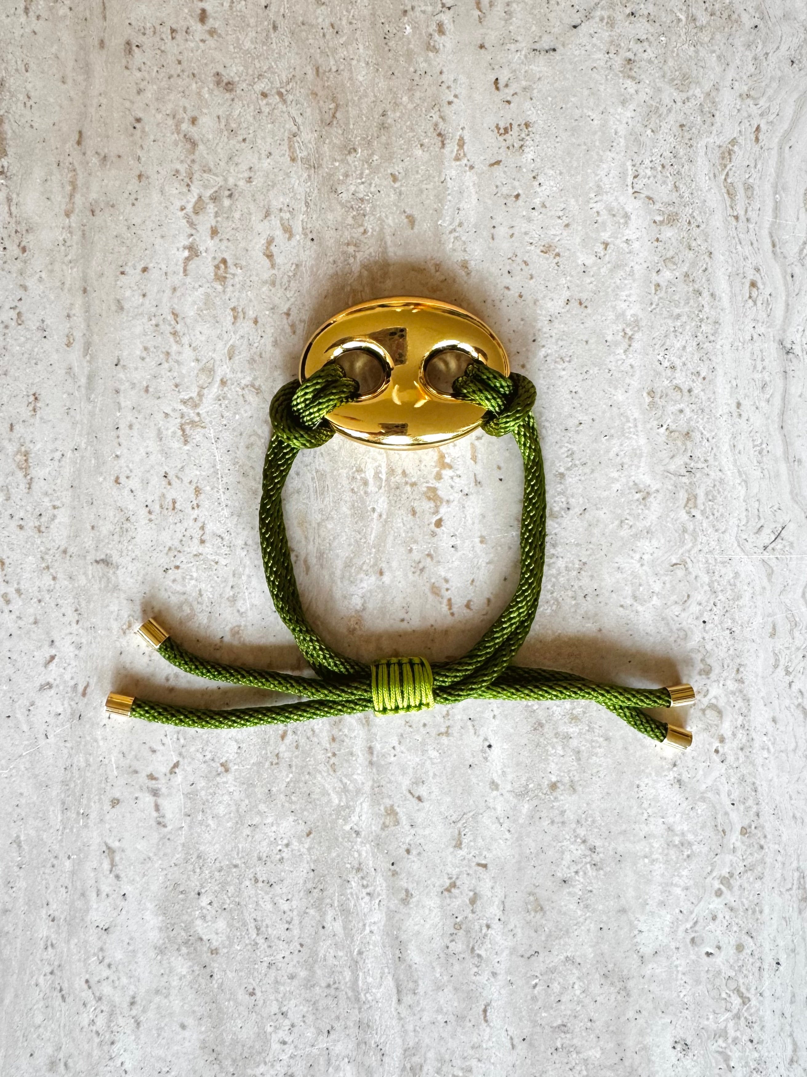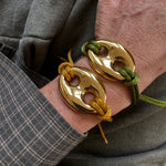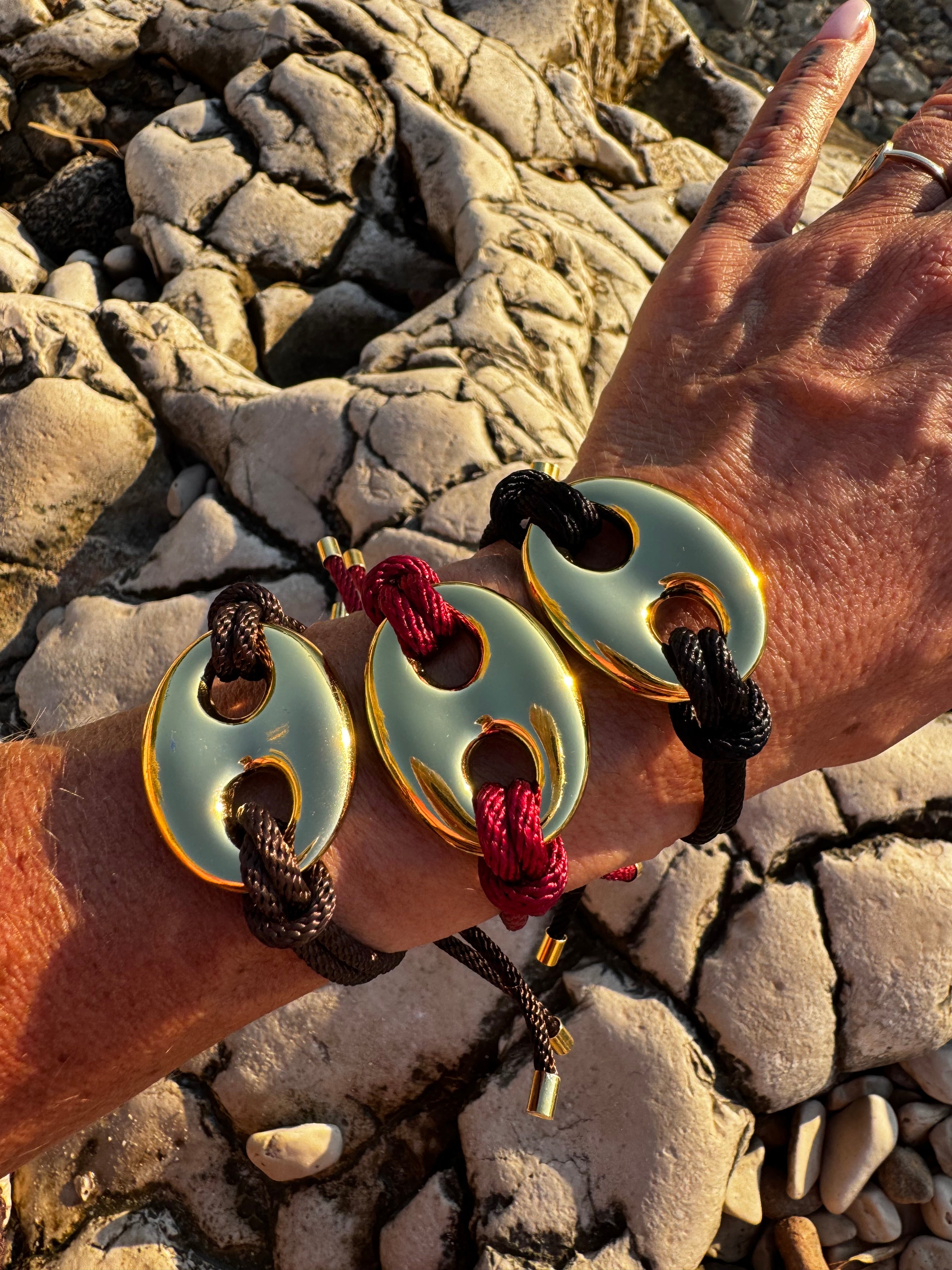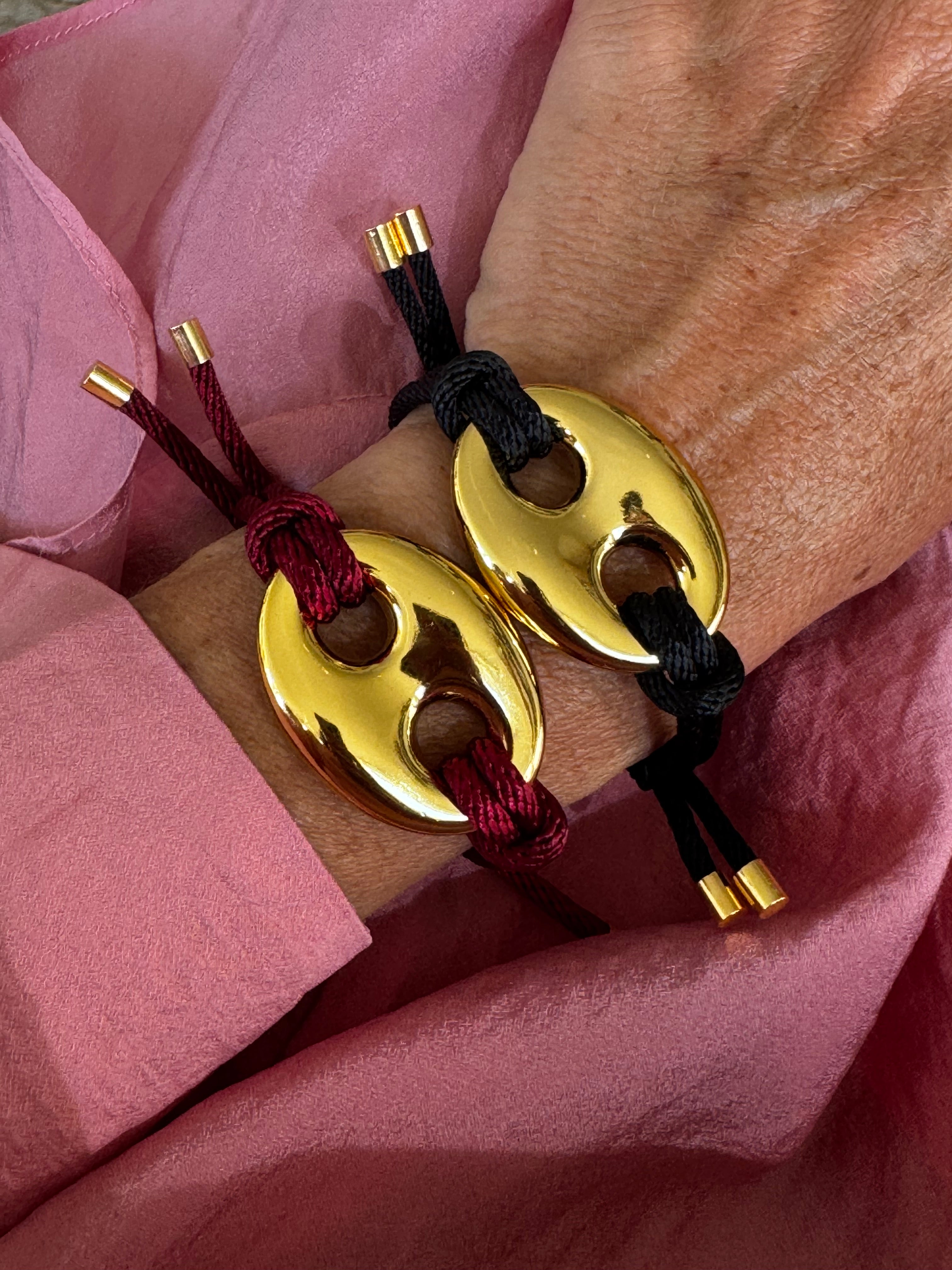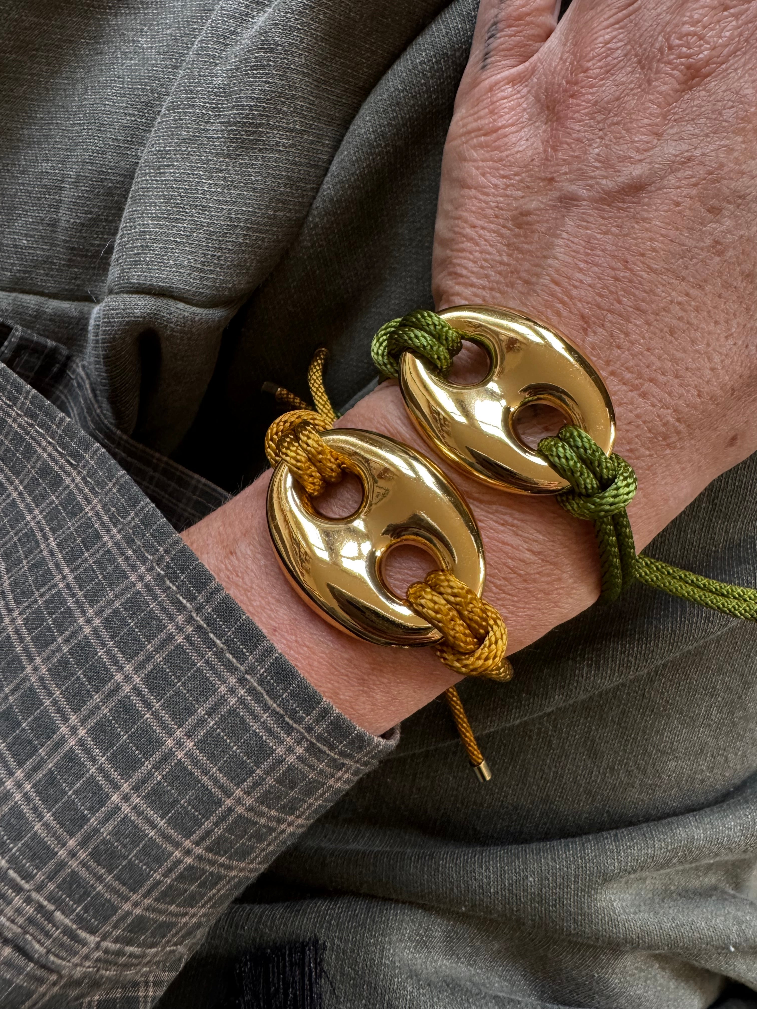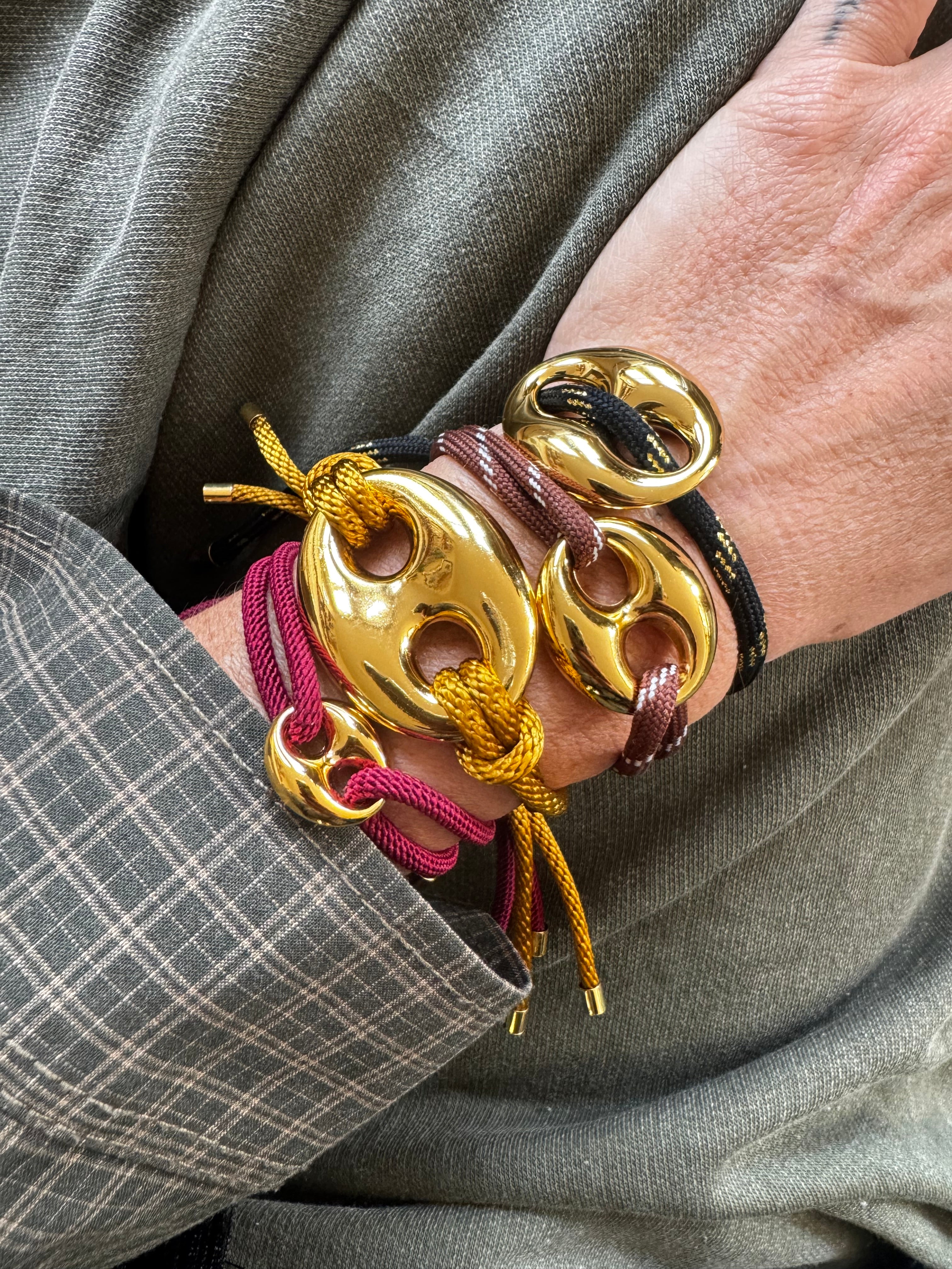 Get ready to rock effortless cool and chic with our Bean Bracelet Gold Big. Made with a big 18kt goldplated stainless steel bean on an adjustable rope bracelet, this piece can be worn separately or stacked for added impact. Don't miss out on this versatile and trendy accessory.