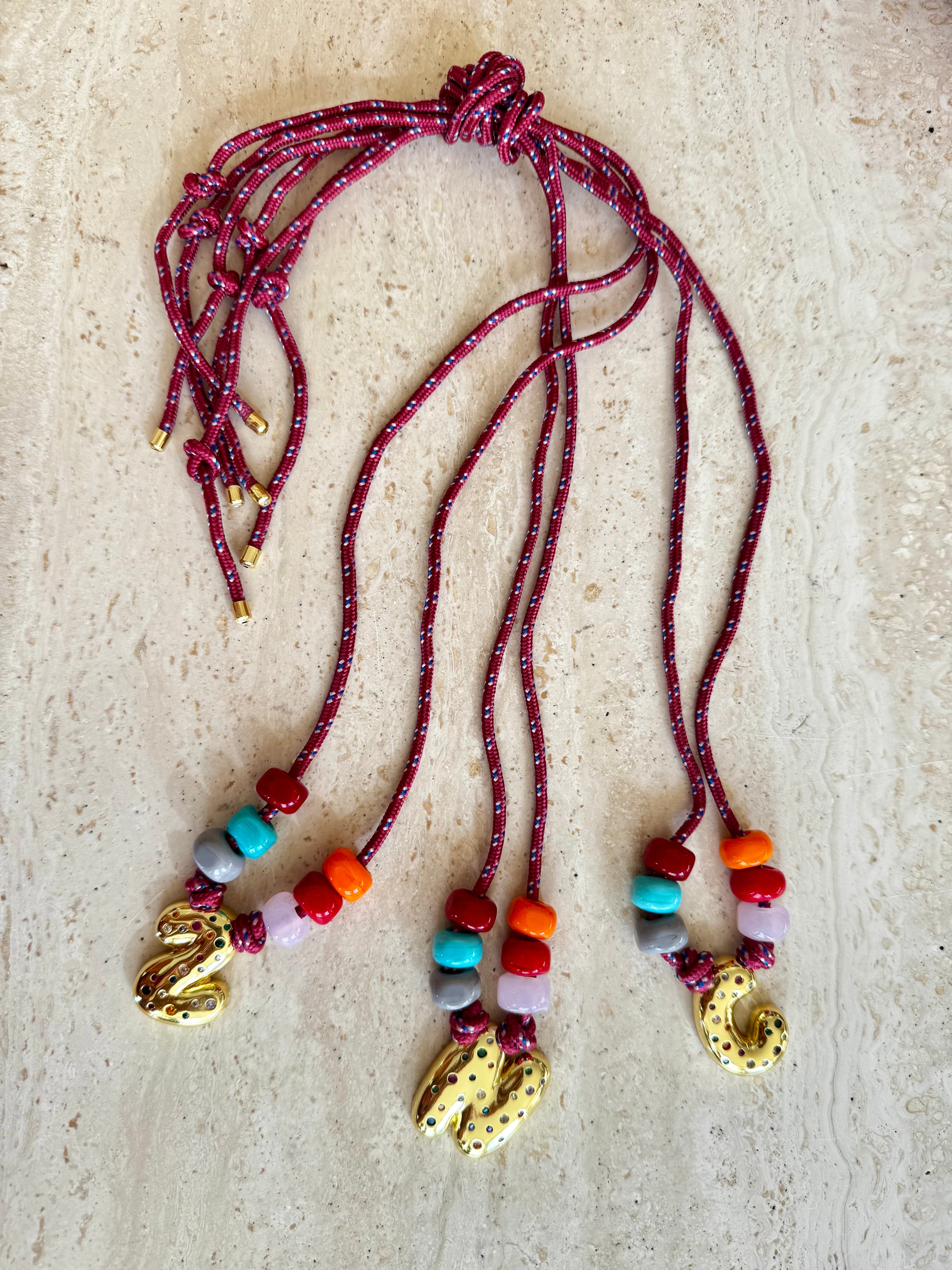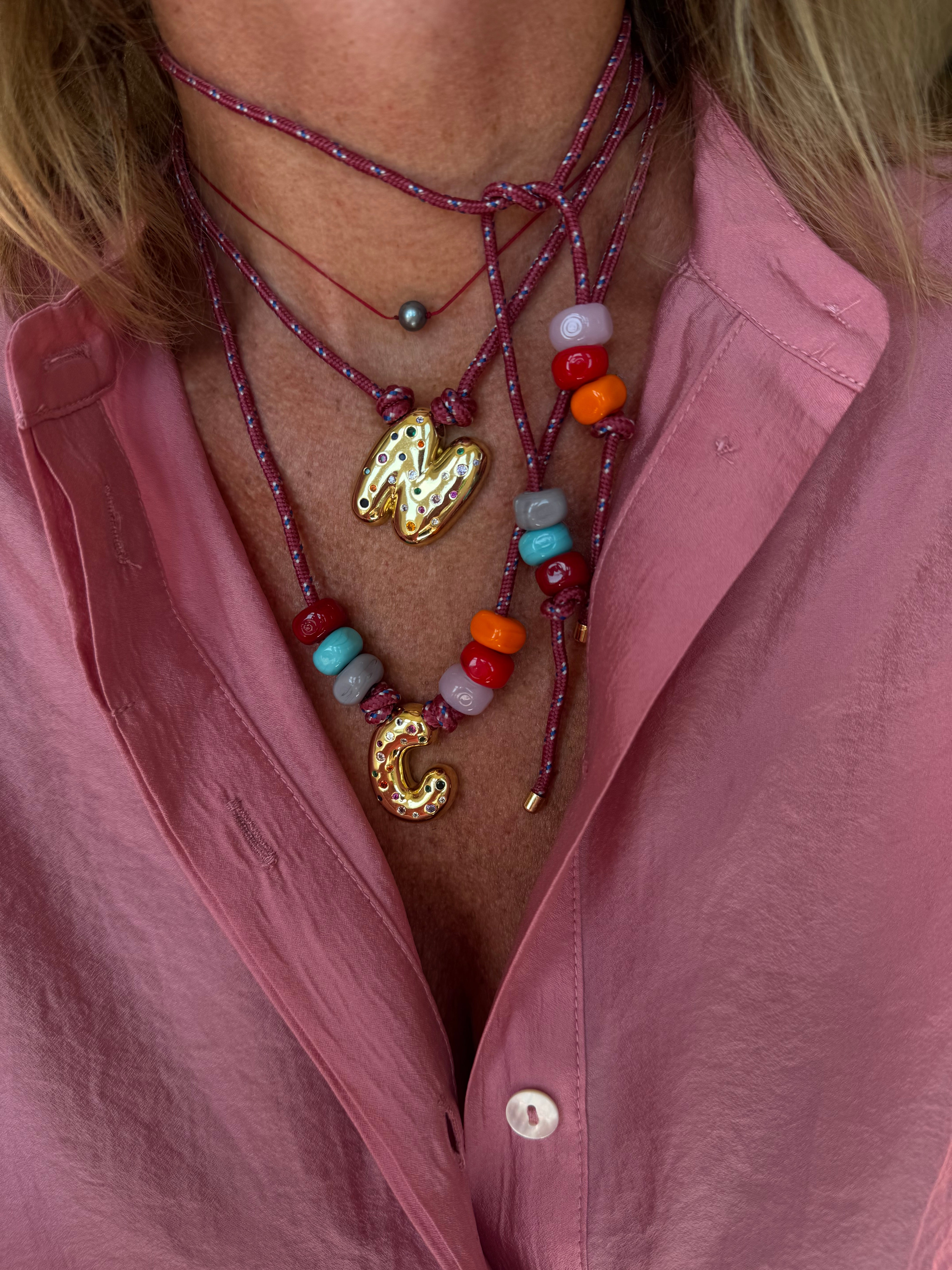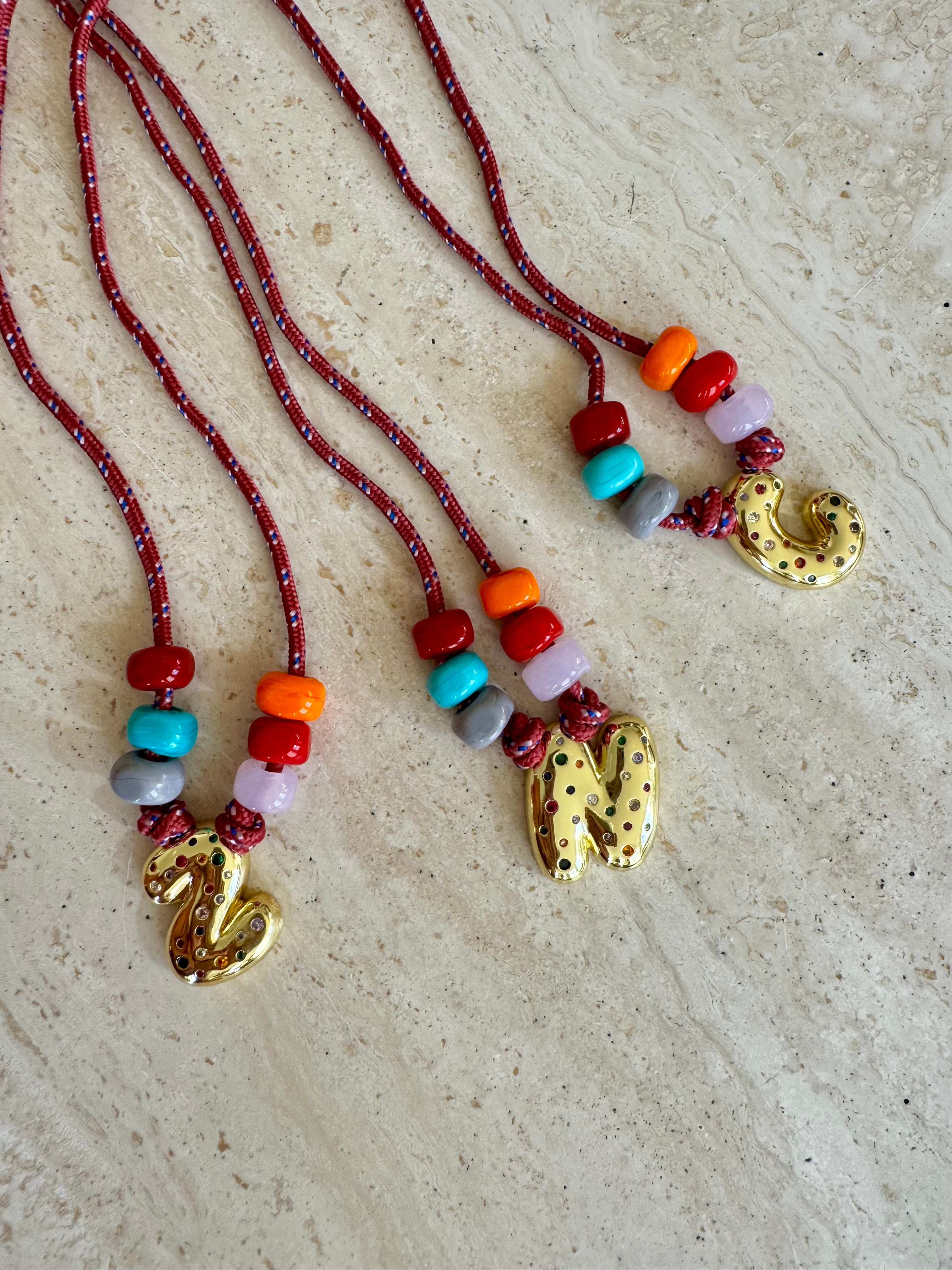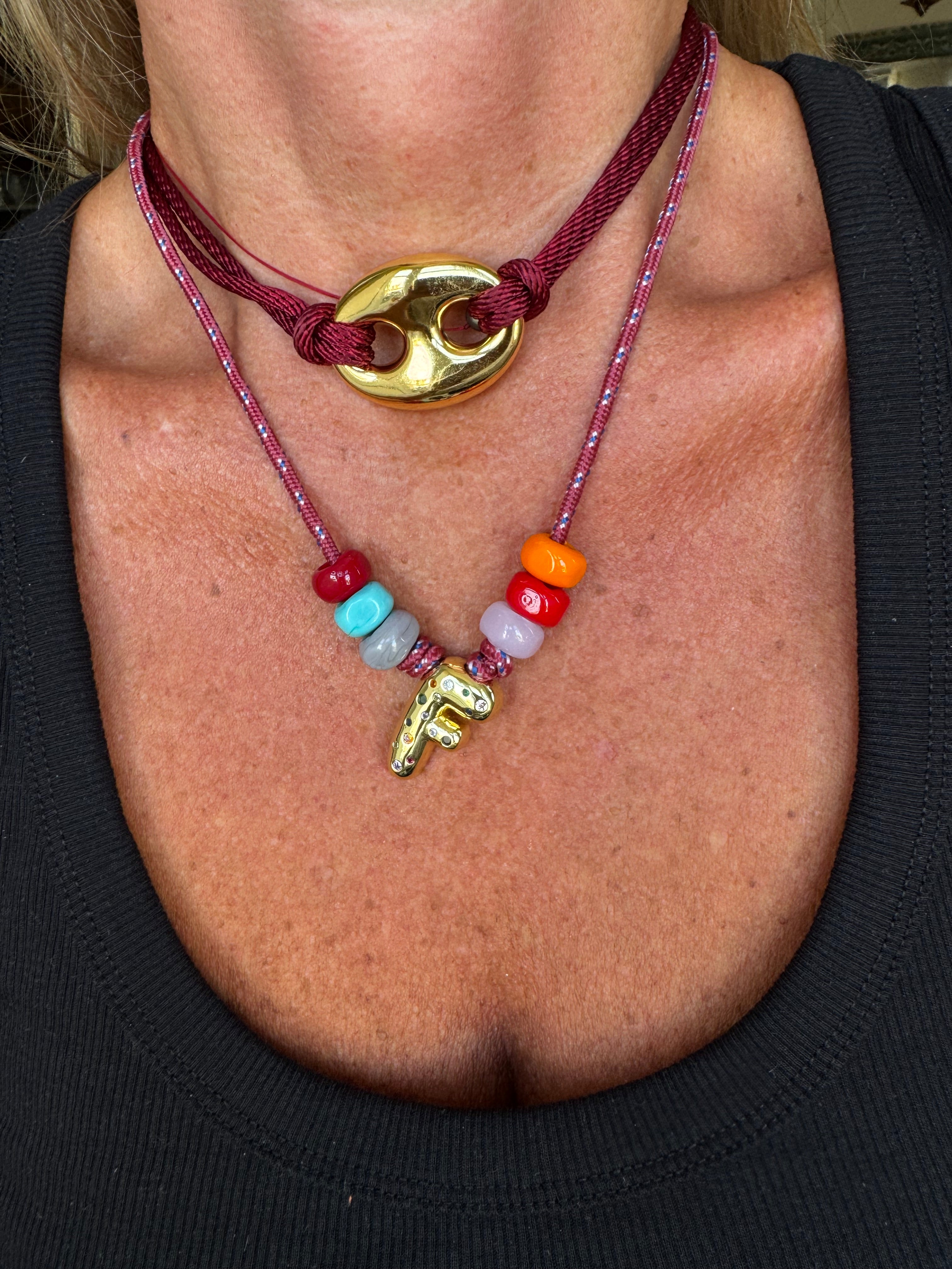 "Introducing our latest edition to the initial necklace collection - bigger and better! Featuring sparkling multi-coloured stones and warm glass beads on a versatile burgundy and blue paracord necklace. Wear it as a necklace, bracelet, or anklet - the styling options are endless!"