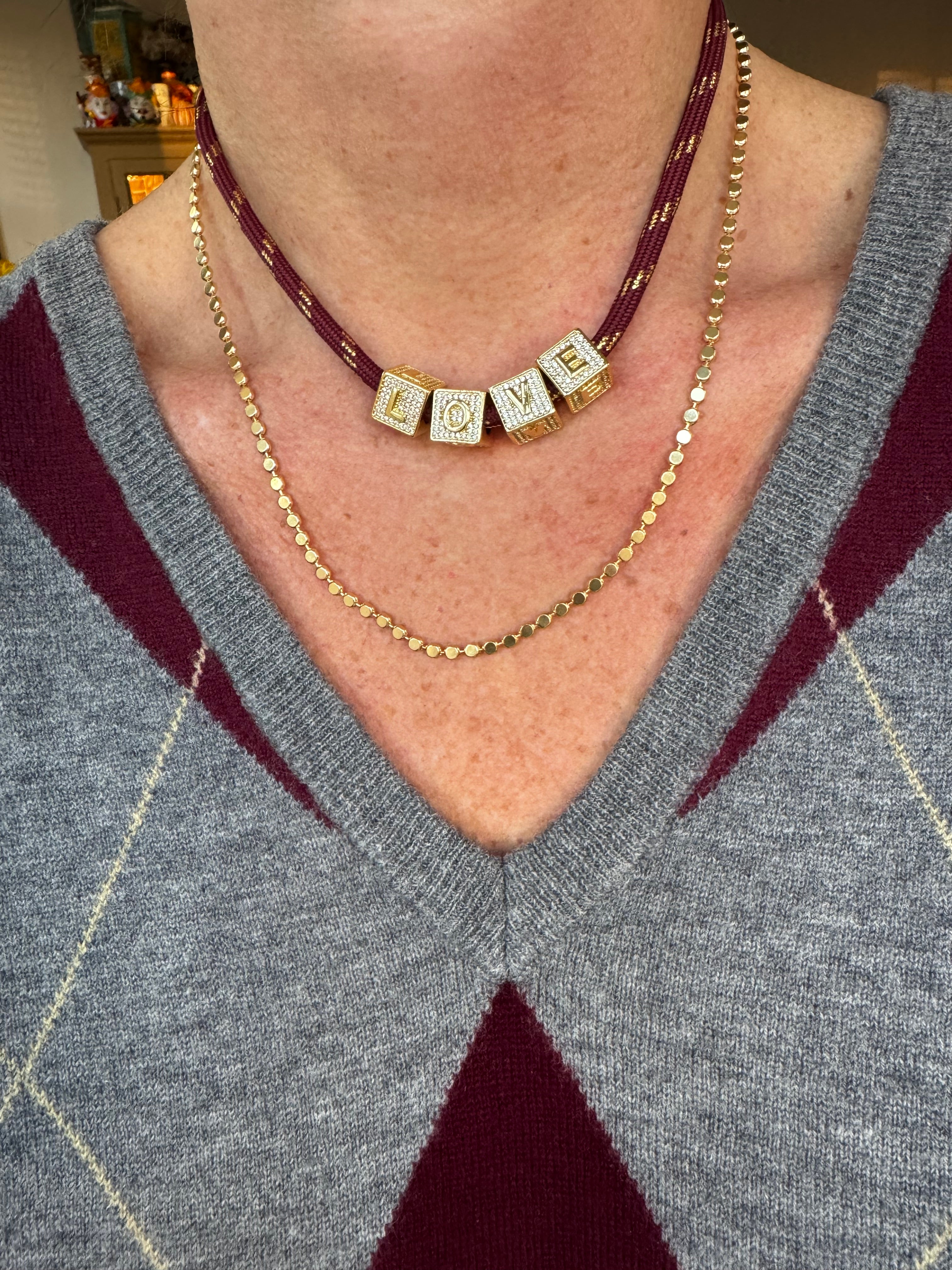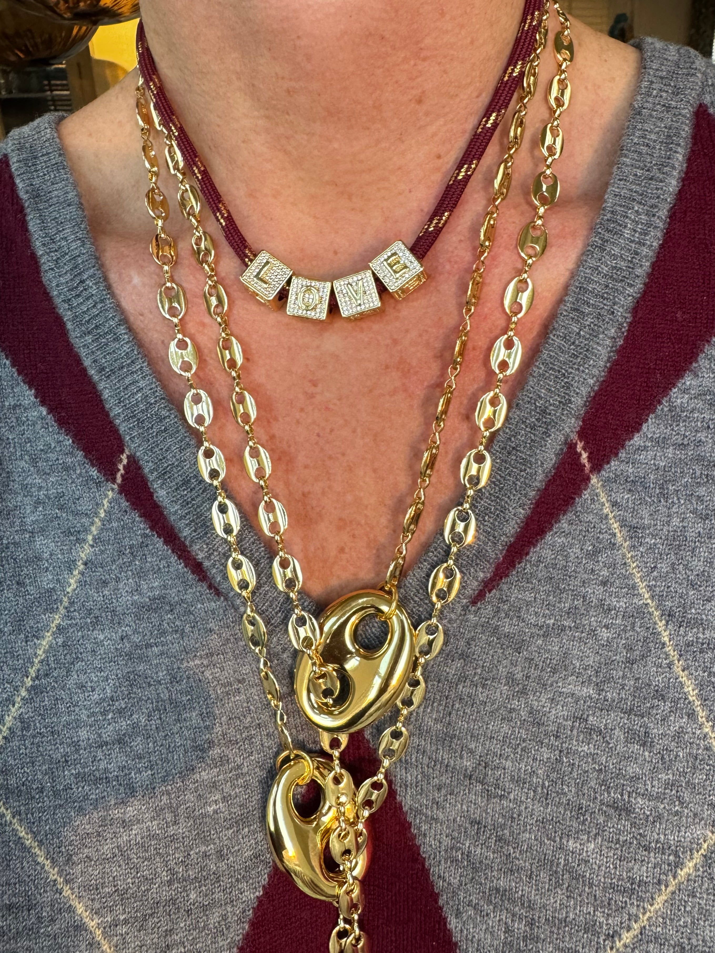 The Love Spark Necklace pairs a deep burgundy paracord rope with shimmering gold plated cubic zirconia letter blocks that spell out “LOVE.” Each cube catches the light beautifully, adding a touch of sparkle to this edgy yet elegant design.