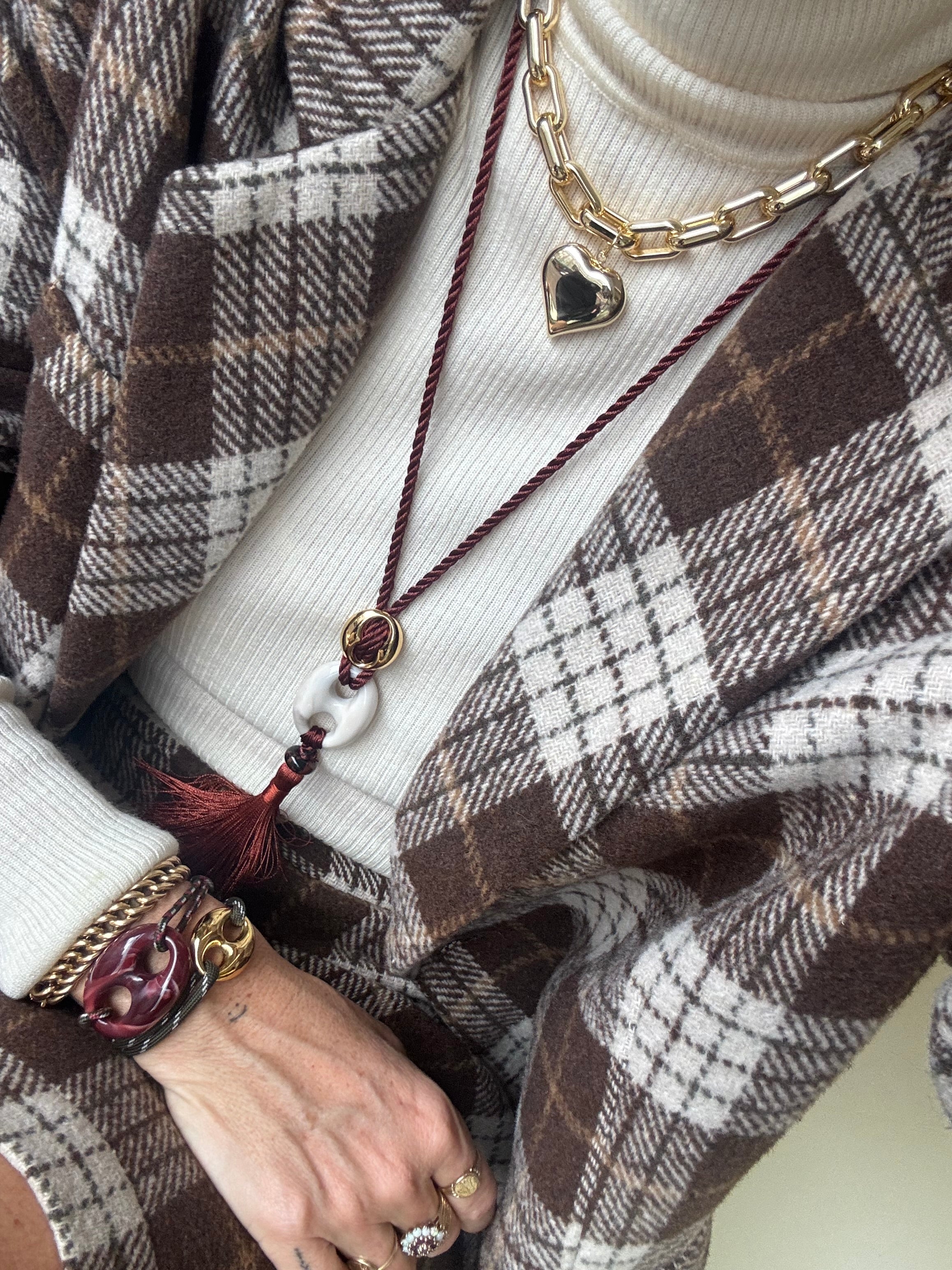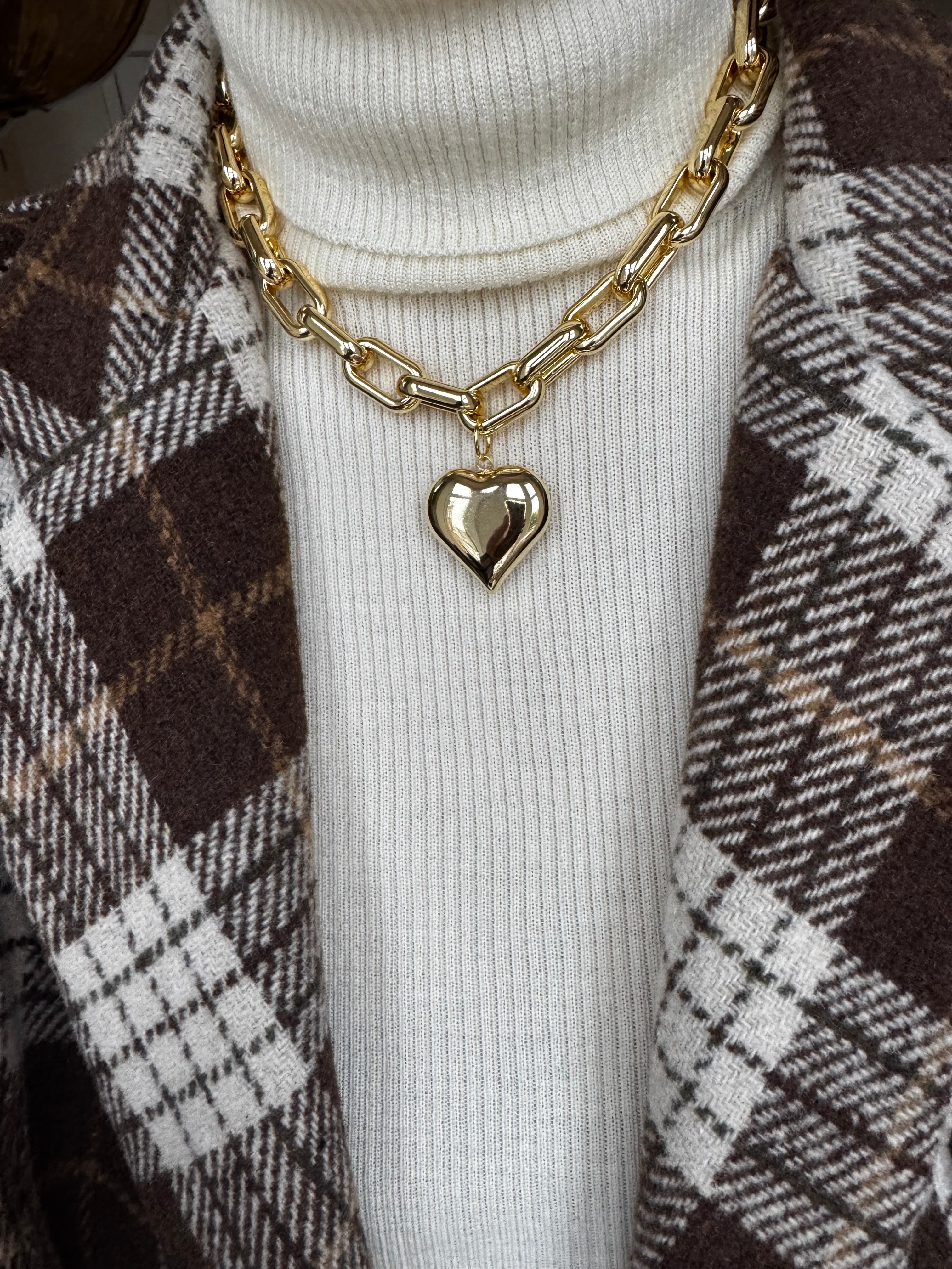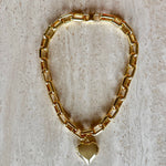 The Roxy Necklace is a bold and statement-making piece for those looking to make a statement. It features a heavy brass gold plated chain and a dangling gold heart pendant, exuding elegance and confidence. Elevate any outfit with this standout accessory.